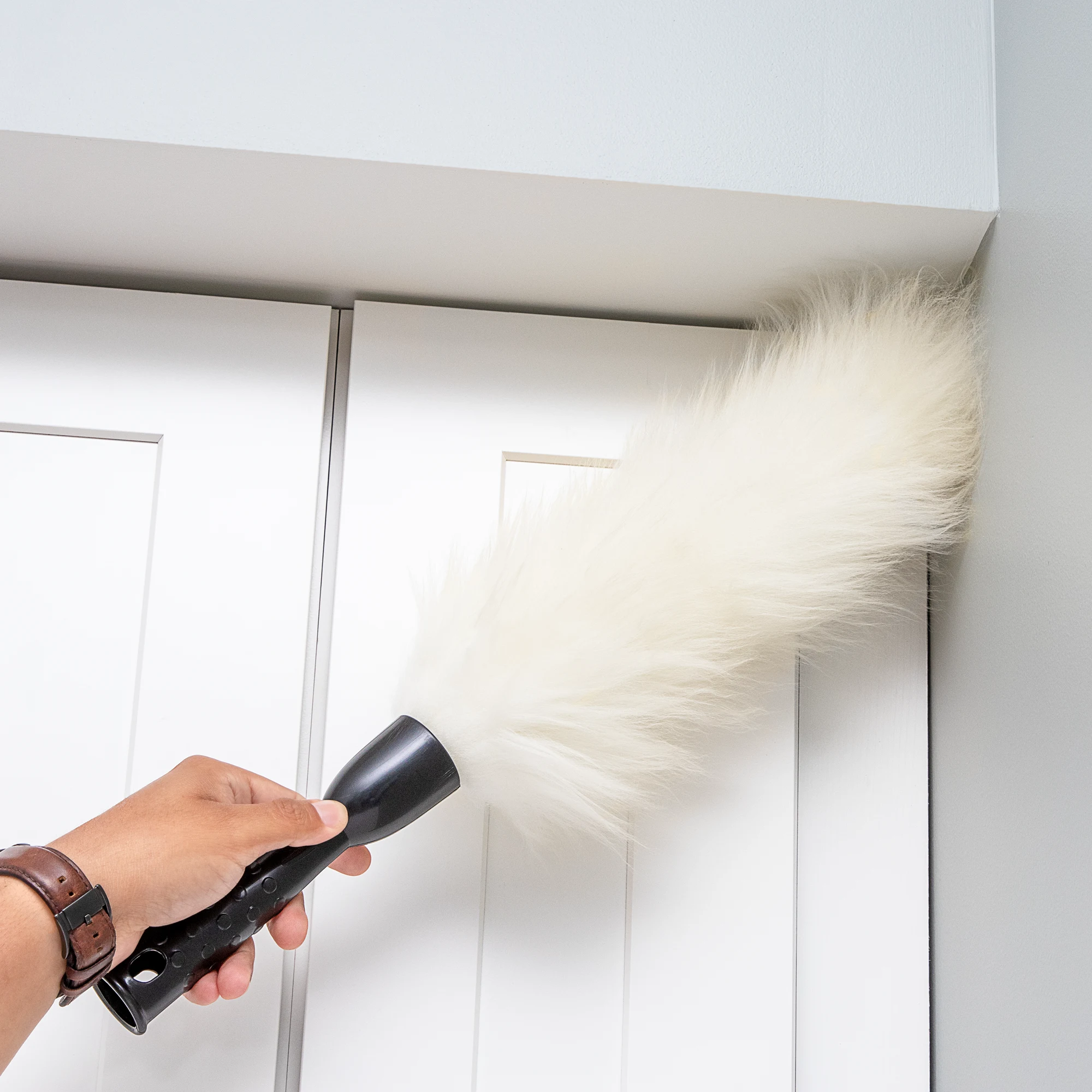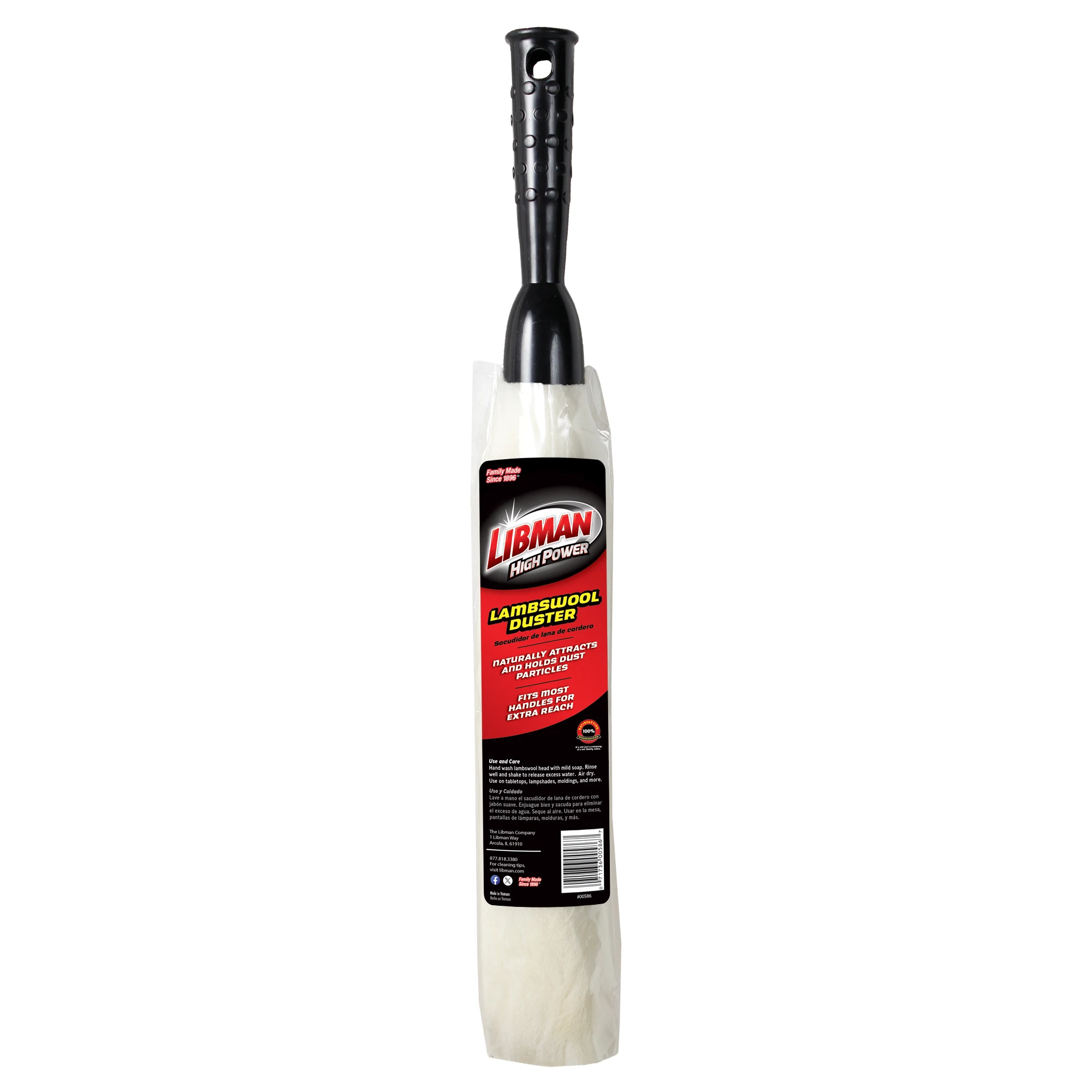 The Lambswool Duster removes dust from multiple surfaces and attaches to extension handles. It attracts spider webs, dust, and fine particles.
