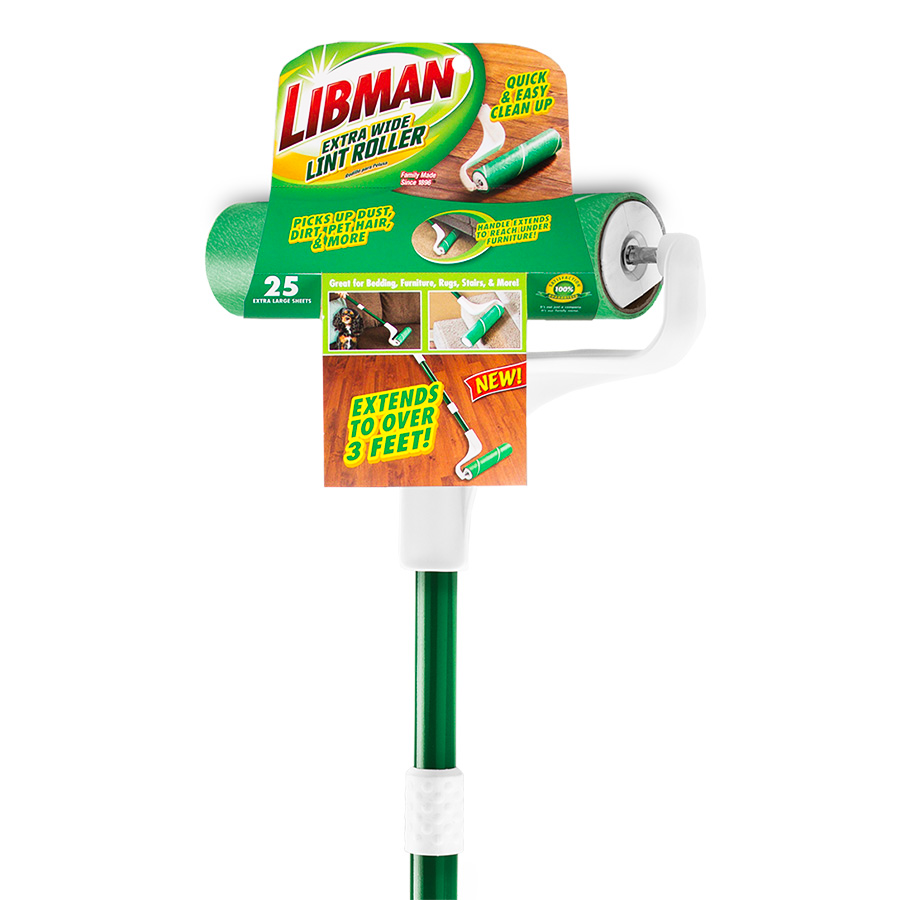 The Extra-Wide Lint Roller features a steel handle that extends to 3 feet in length. This unique design allows for a standing or sitting roll of the sticky sheets over large surfaces.