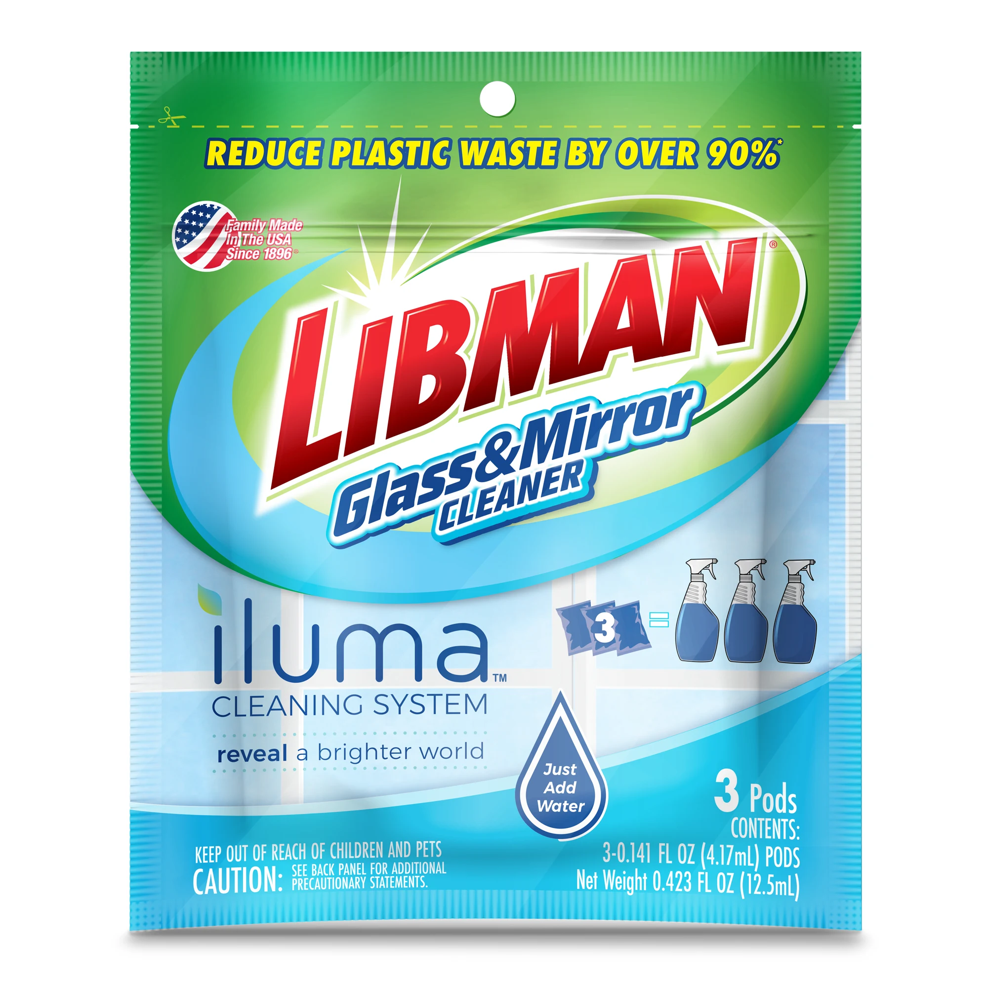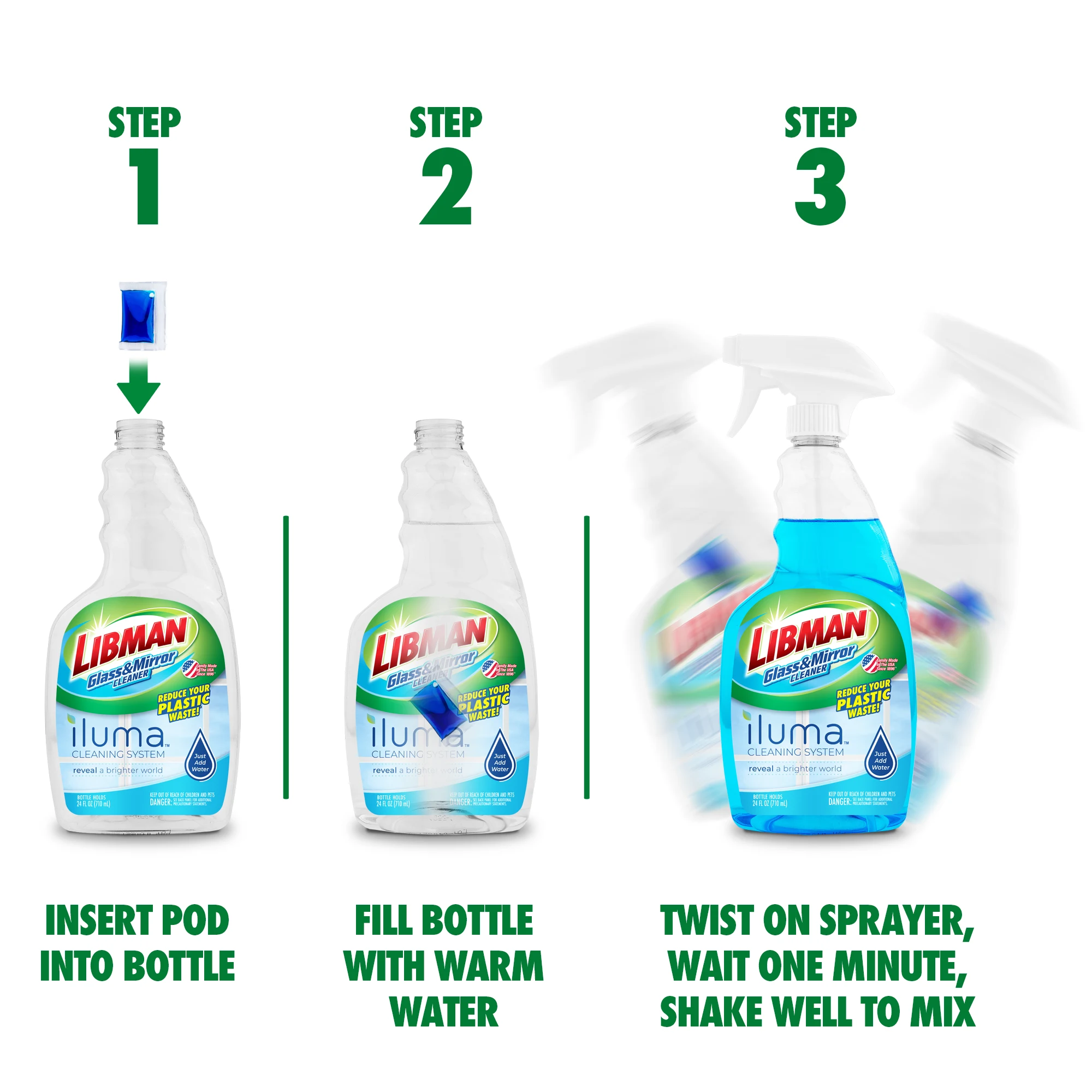 Reduce your plastic waste and clean your glass, chrome, and mirrors more completely with iluma™ Concentrated Cleaning Refills. At the Libman Company, we believe in creating quality products with cutting-edge technology to make life easier for you and reduce waste in the process. The iluma™ Cleaning System reduces plastic waste and carbon footprints by reusing plastic containers, and reducing your waste from plastic cleaning bottles by up to 90%!