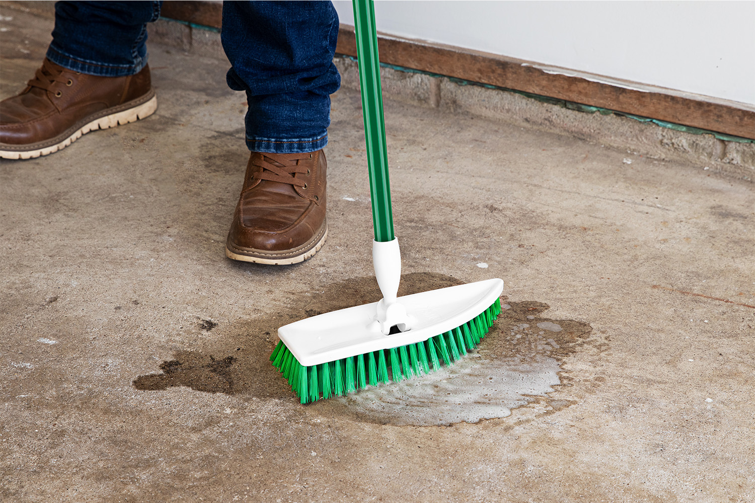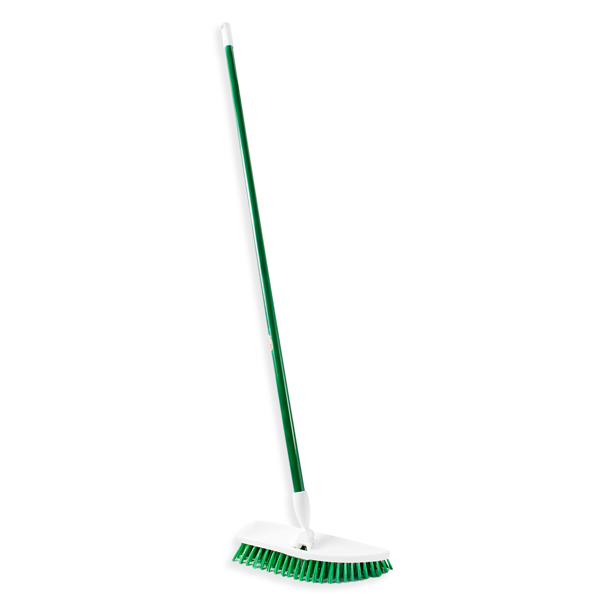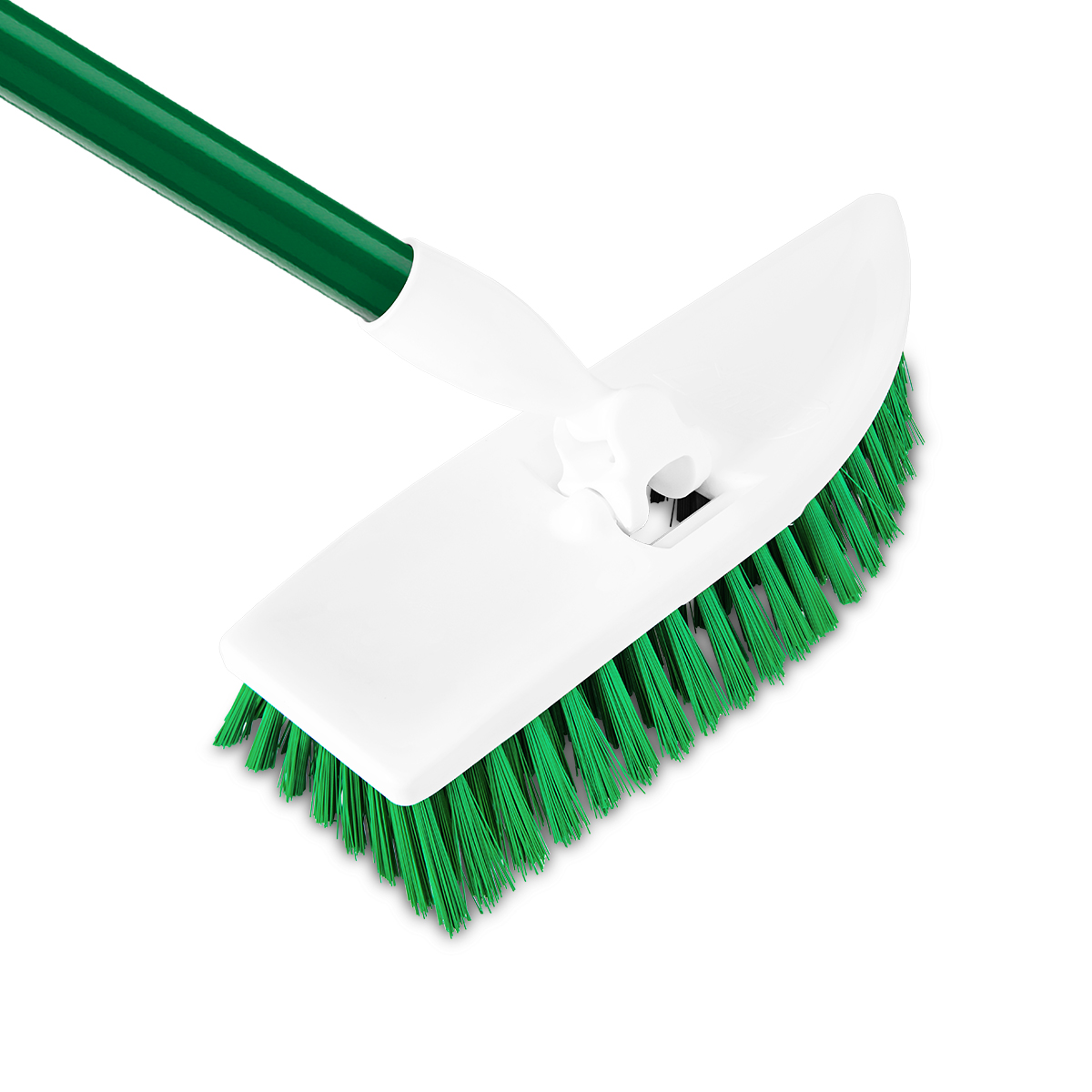 The No Knees Floor Scrub is a tough scrubber, attached to a quality handle, that allows for floor scrubbing without hurting your knees. It has a pointed head to reach corners, and it pivots 180 degrees. This tool works great in bathrooms, kitchens, and more.