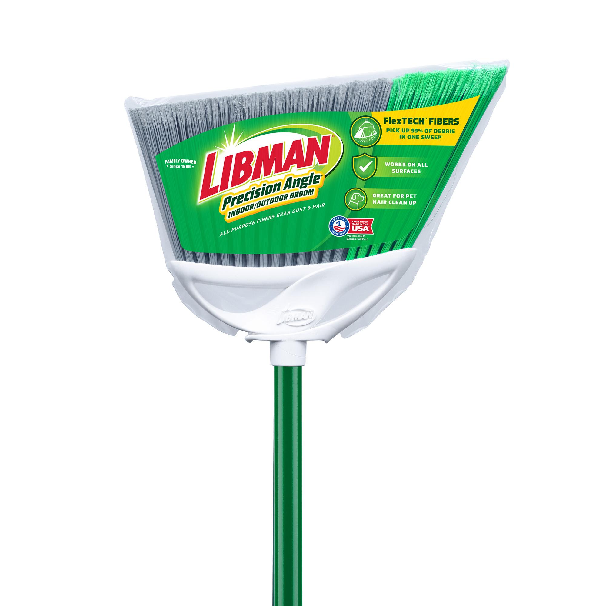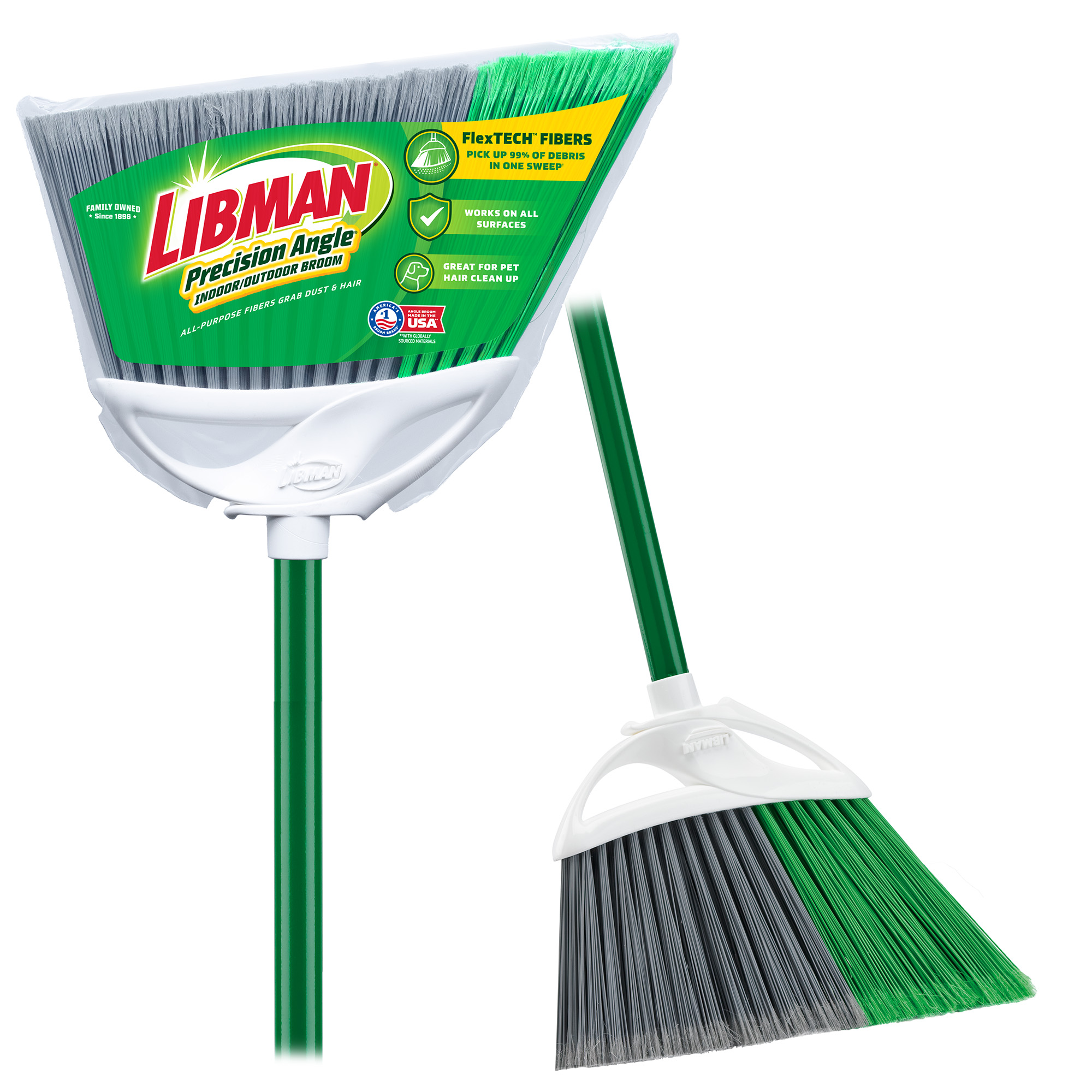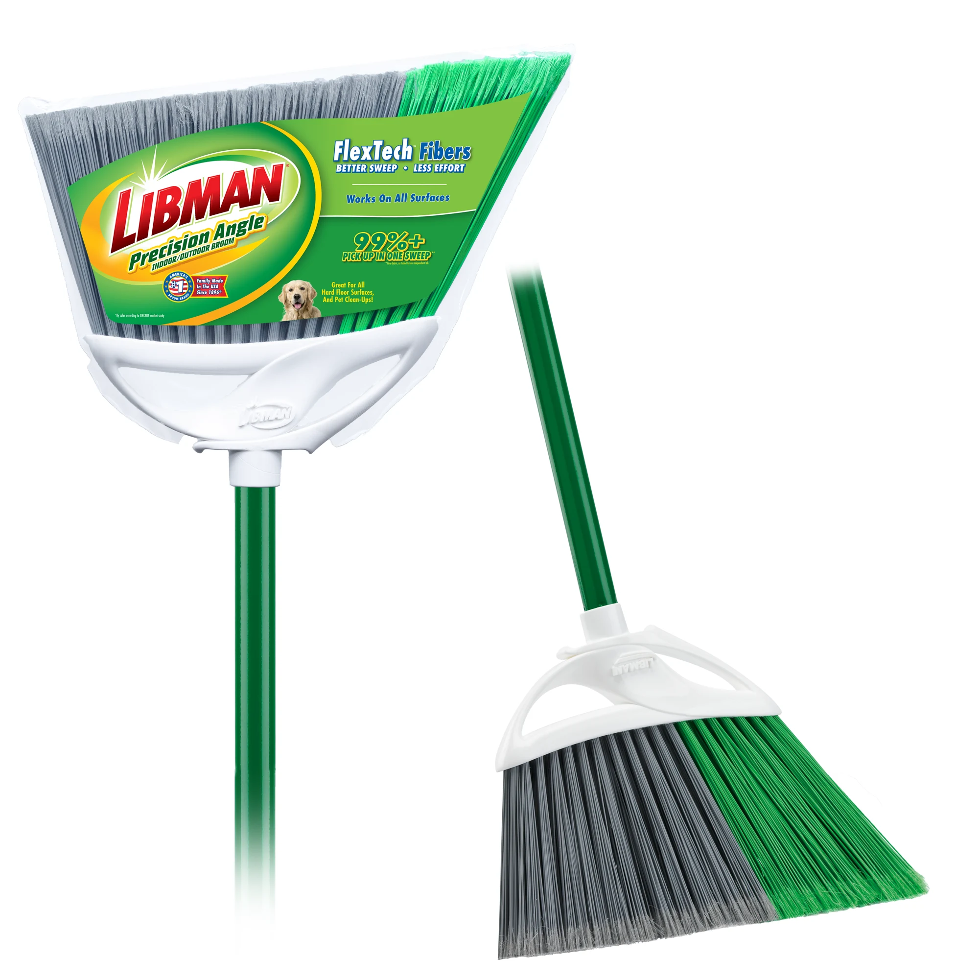 Make clean-up a snap with the Precision Angle® Indoor/Outdoor Broom. Featuring 5-inch long FlexTech™ fibers made from recycled PET bottles, these fibers are precisely cut to remove 99% of dust, dirt, and hair in one sweep. The guaranteed quality construction of the Precision Angle® Broom makes it the ideal cleaning tool for sweeping up inside or out.