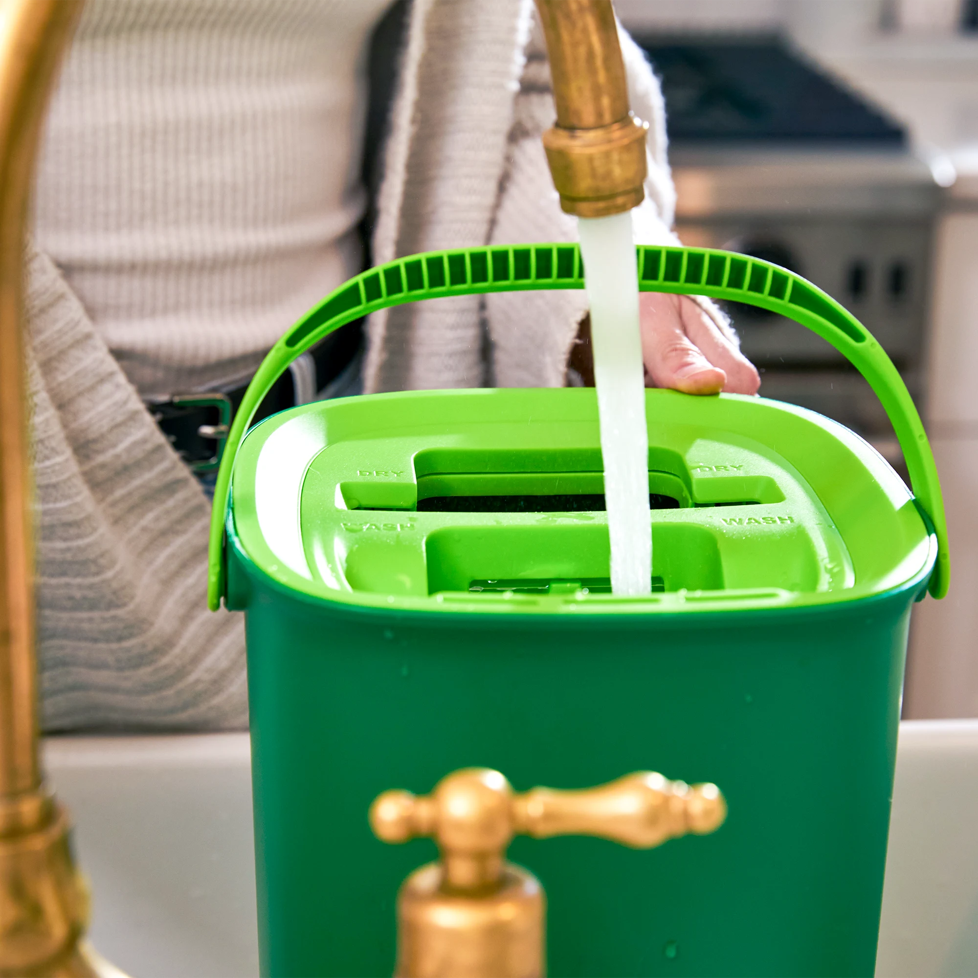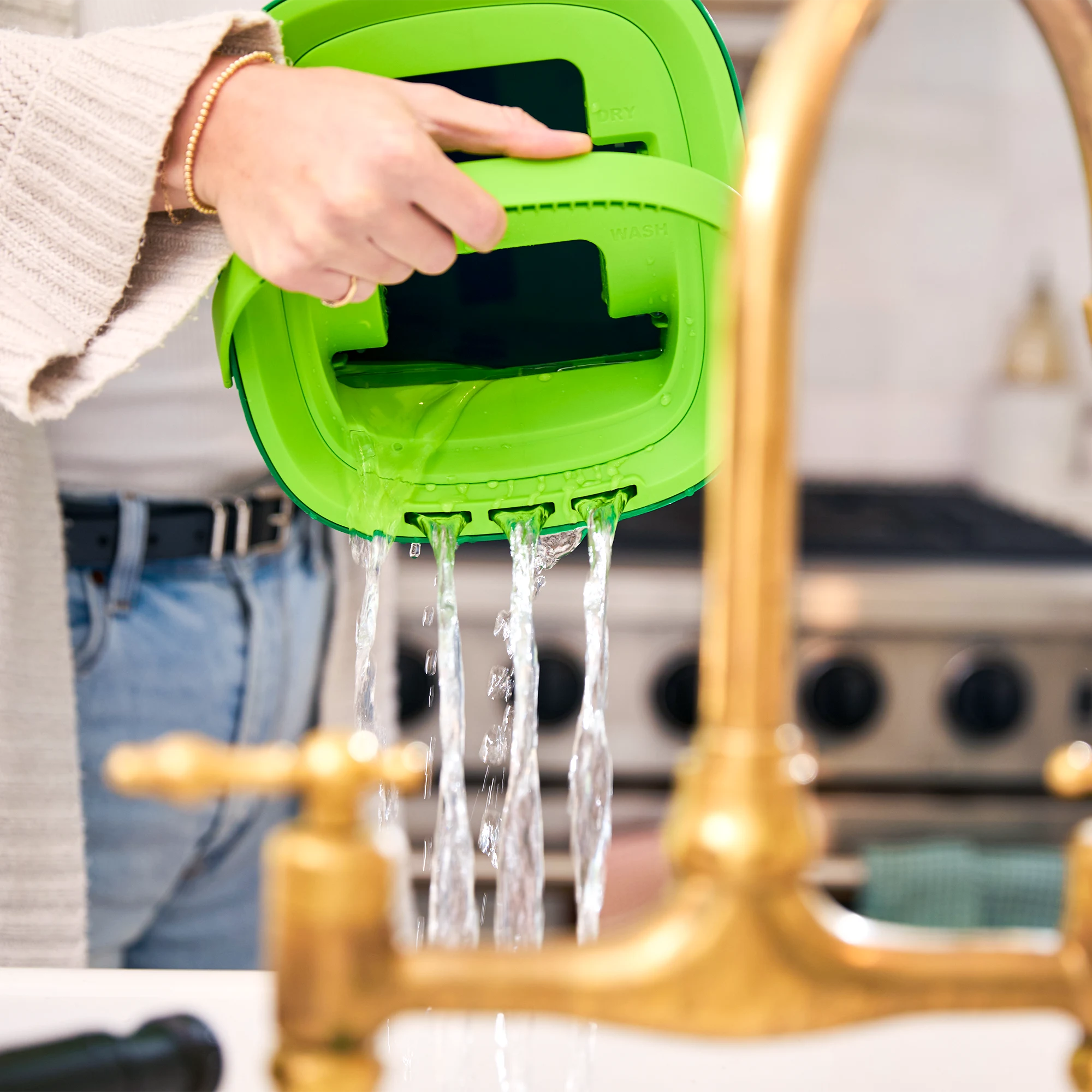 Add this versatile mop to your list of cleaning supplies! The mop bucket has a dual chamber system that works to remove water and dirt efficiently from the mop head. It is safe to use on all hard surfaces, including hardwood, vinyl, laminate, tile, linoleum, and more, but tough enough for larger messes. The Rinse ‘n Wring™ microfiber pads are machine-washable, and the system comes with one additional microfiber head (two pads total).