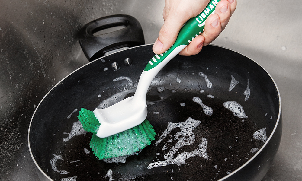 Person cleaning pan with dish brushGlenn's Favorite - The Big Job Kitchen Brush