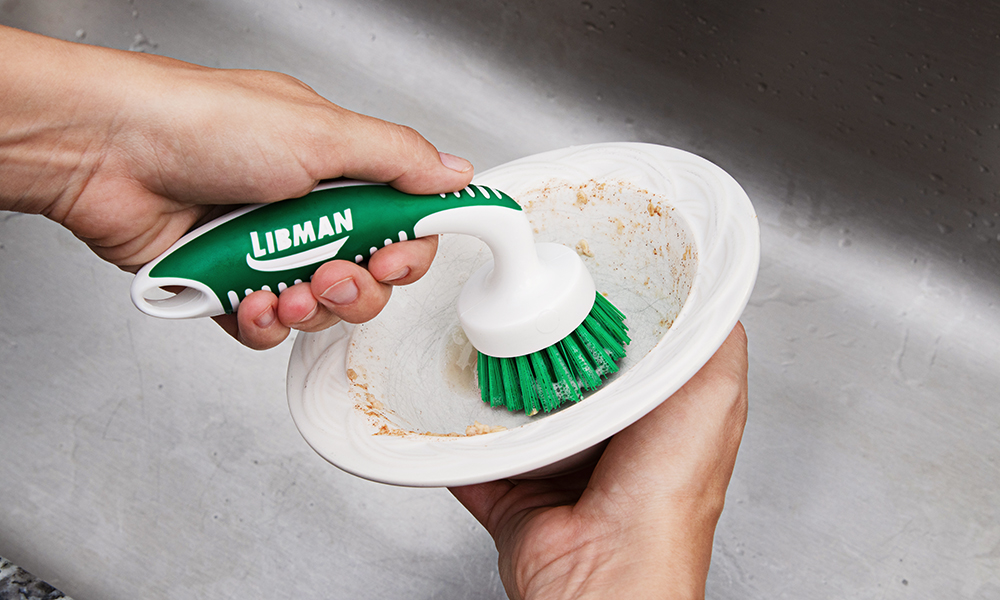 Person cleaning bowl with dish brushTom's Favorite - The Curved Kitchen Brush