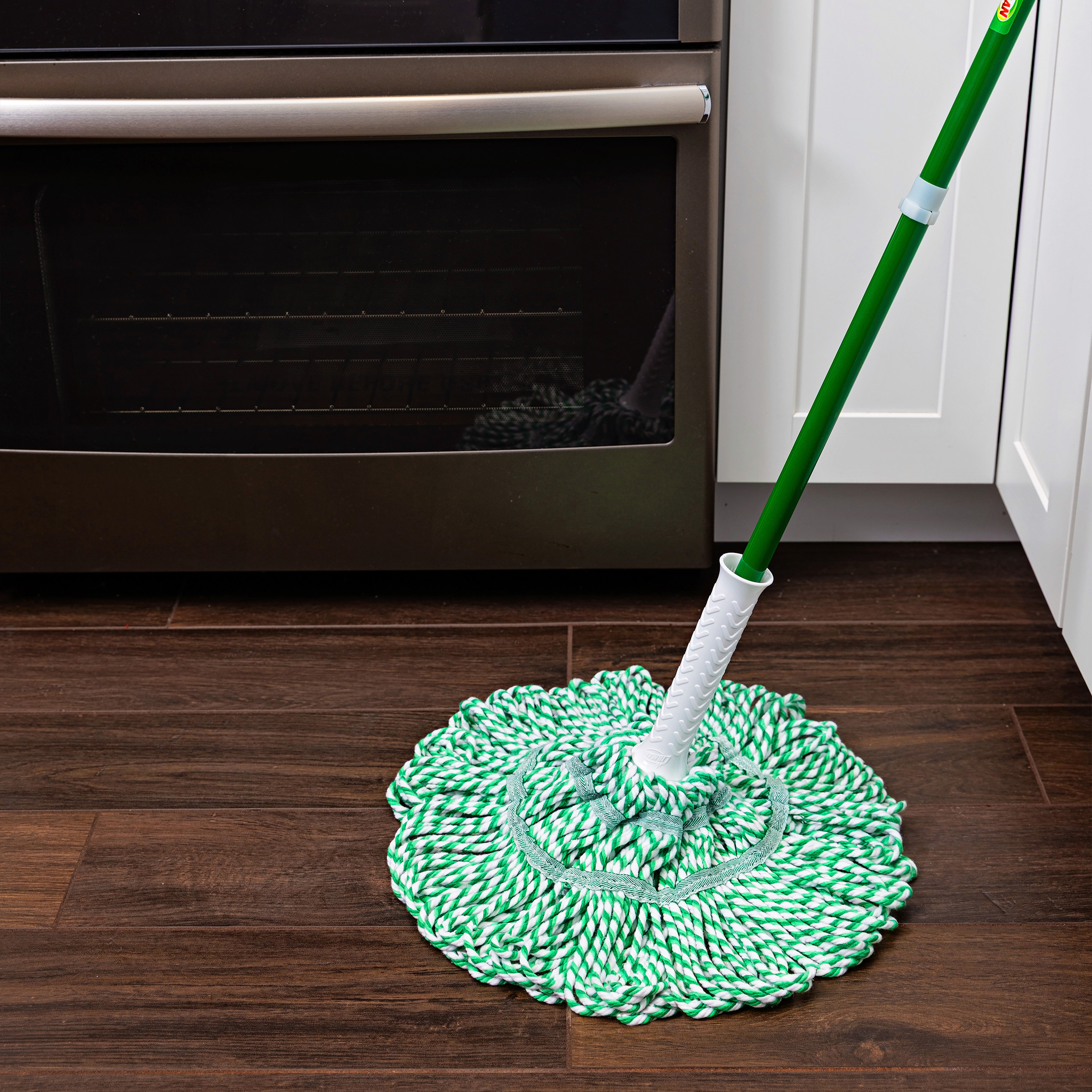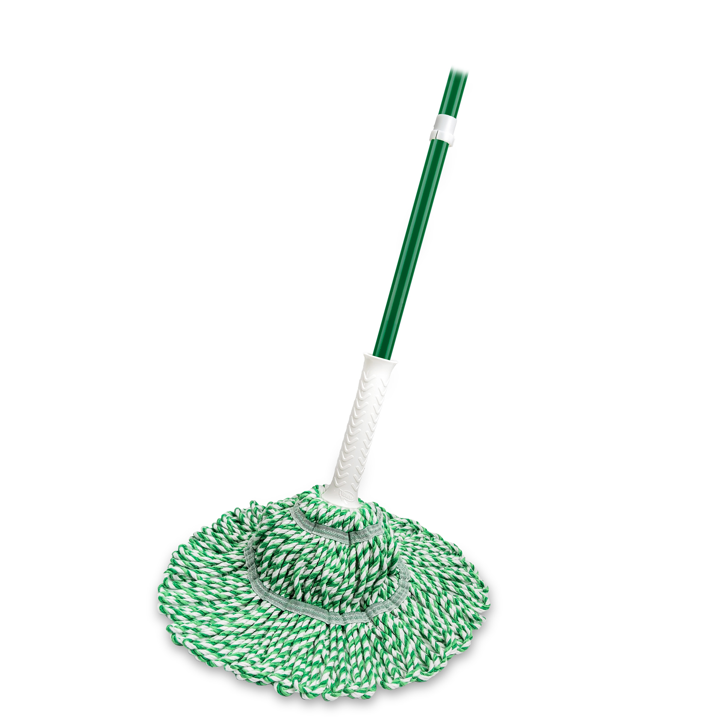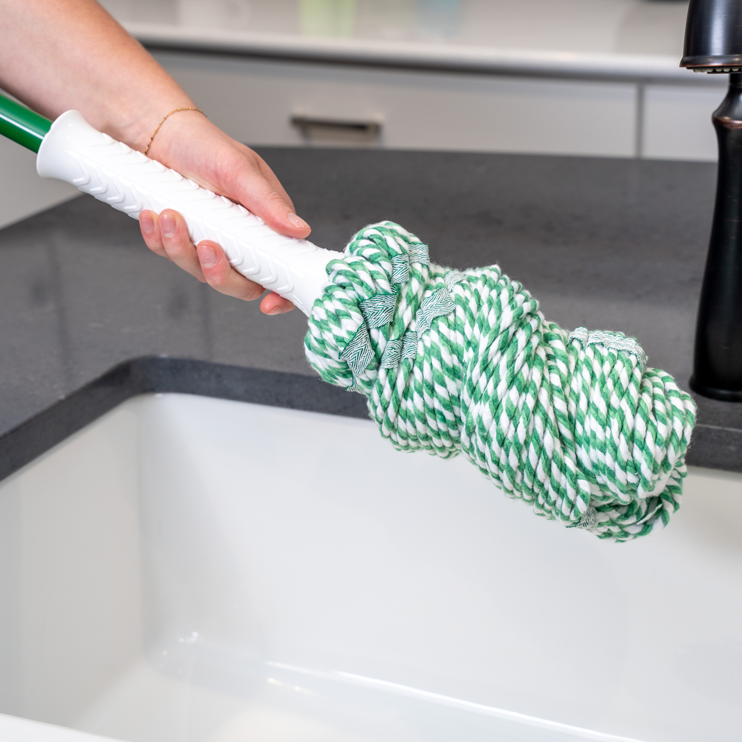 - Three tangle-resistant green bands are incorporated into the polyester and yarn mop head