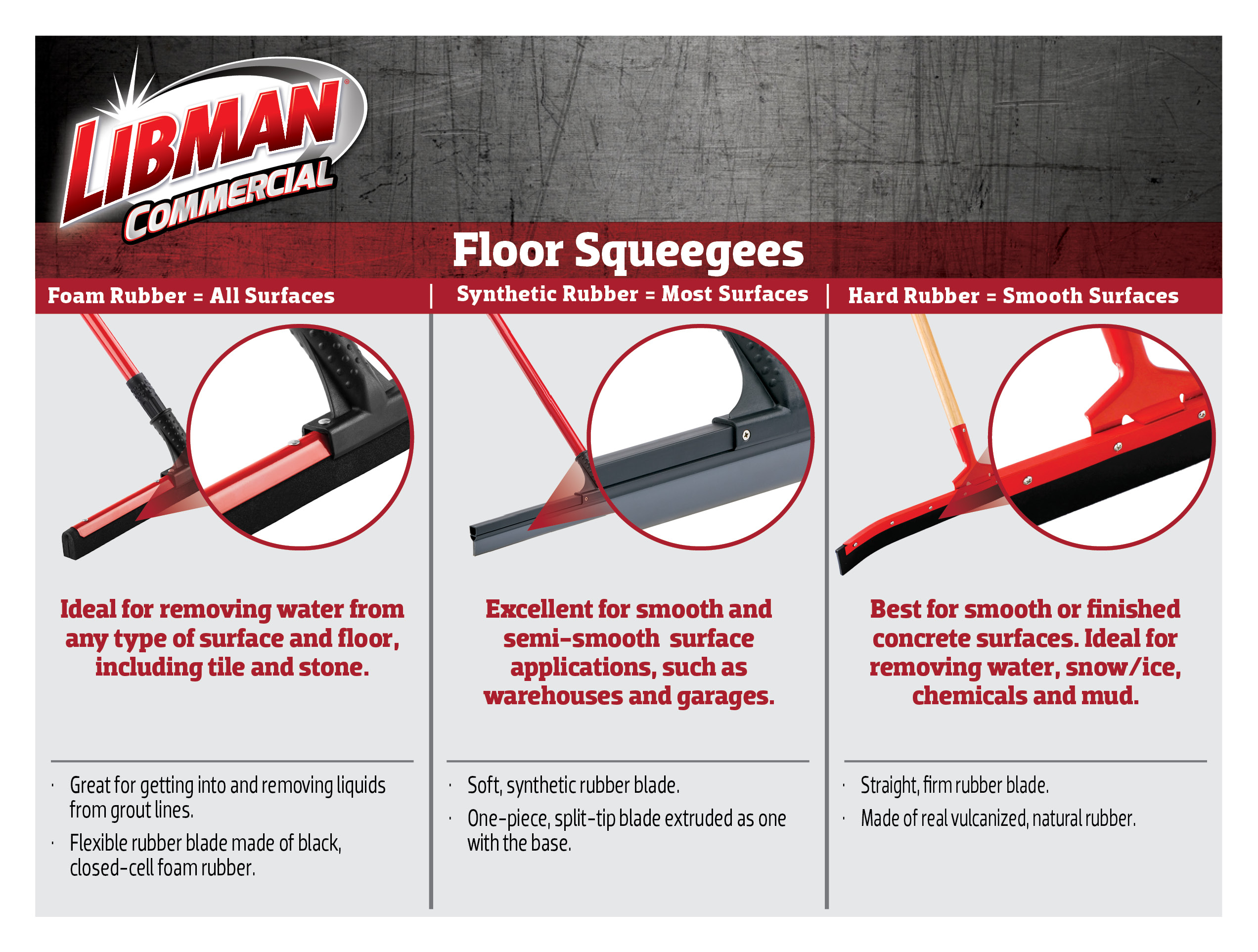 - Flexible rubber blade mounted perfectly straight to remove water from the deepest cracks and rough surfaces, such as patios, walkways, and industrial sites