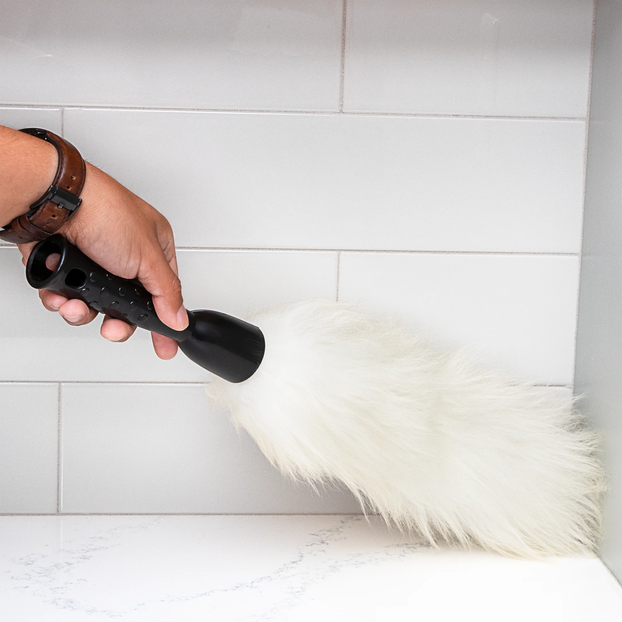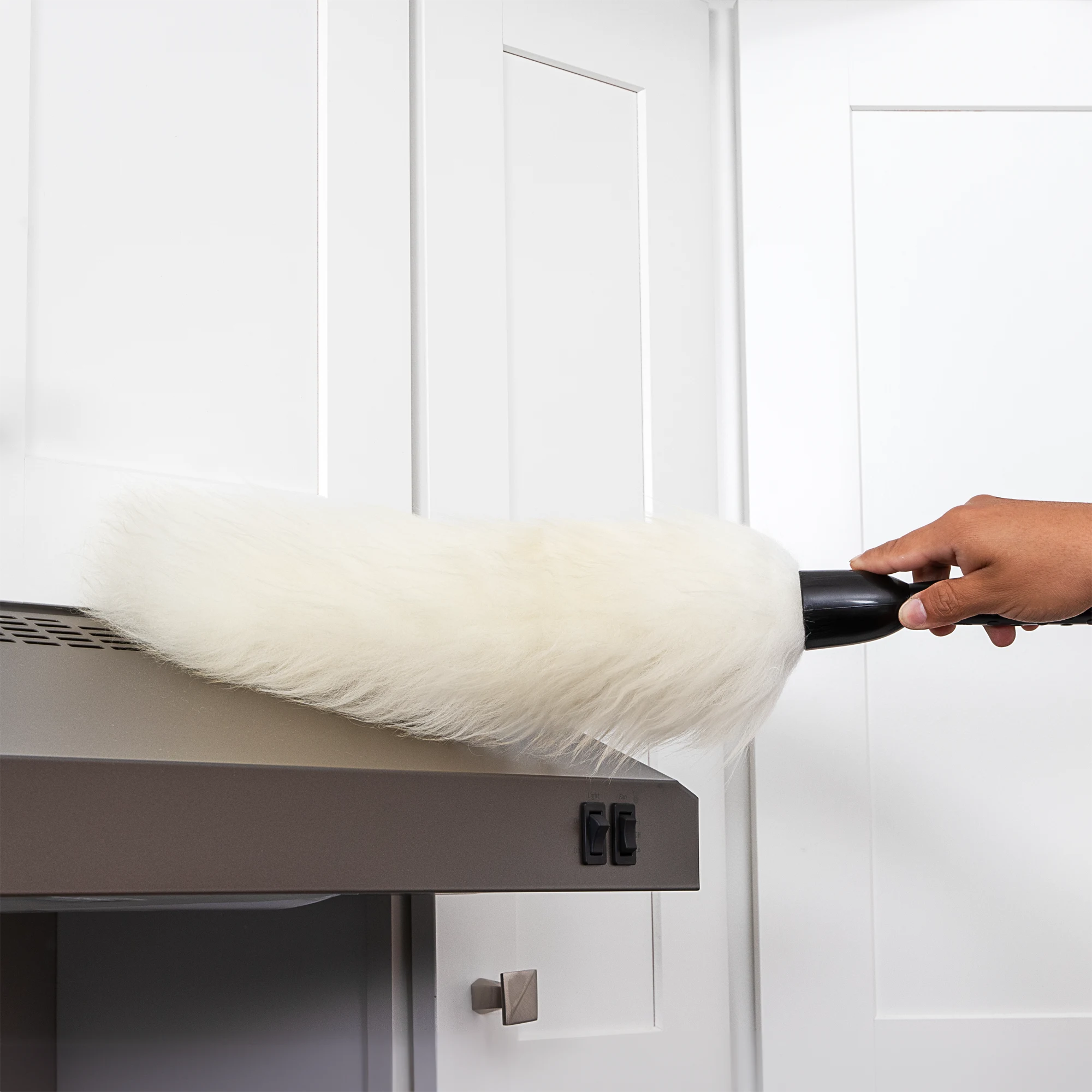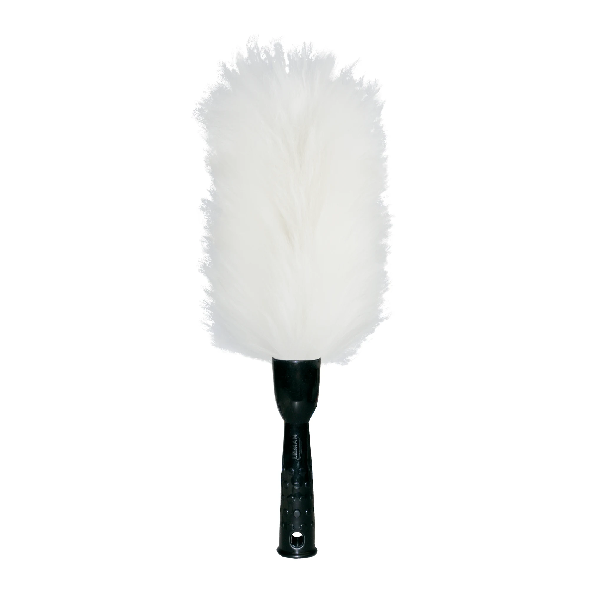 The Lambswool Duster removes dust from multiple surfaces and attaches to extension handles. It attracts spider webs, dust, and fine particles.