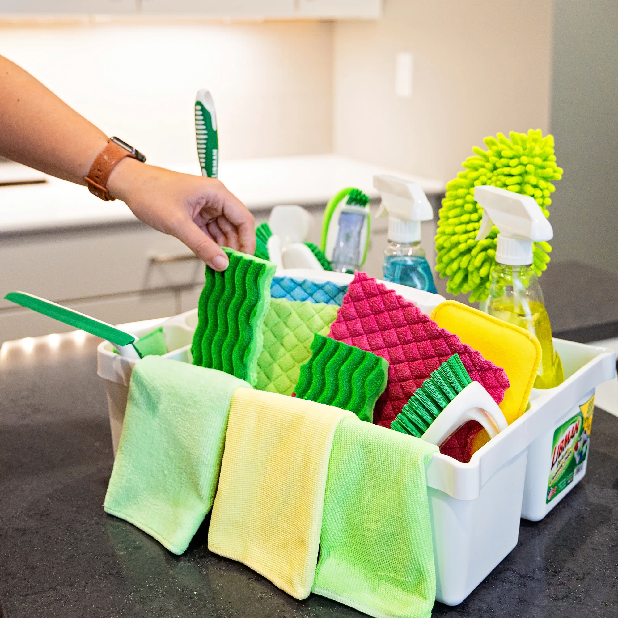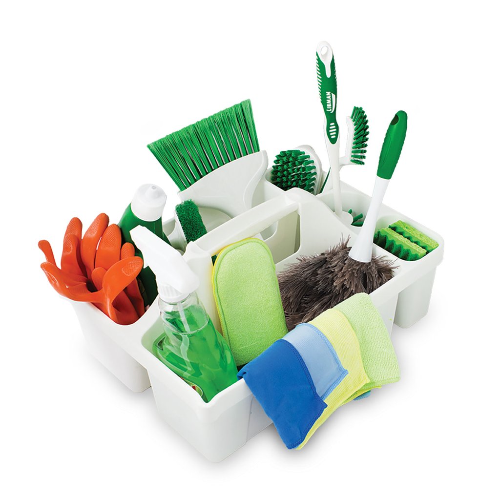 The Deluxe Cleaning Caddy features special compartments for a variety of cleaners and cleaning tools. It holds up to six 36 oz. bottles.