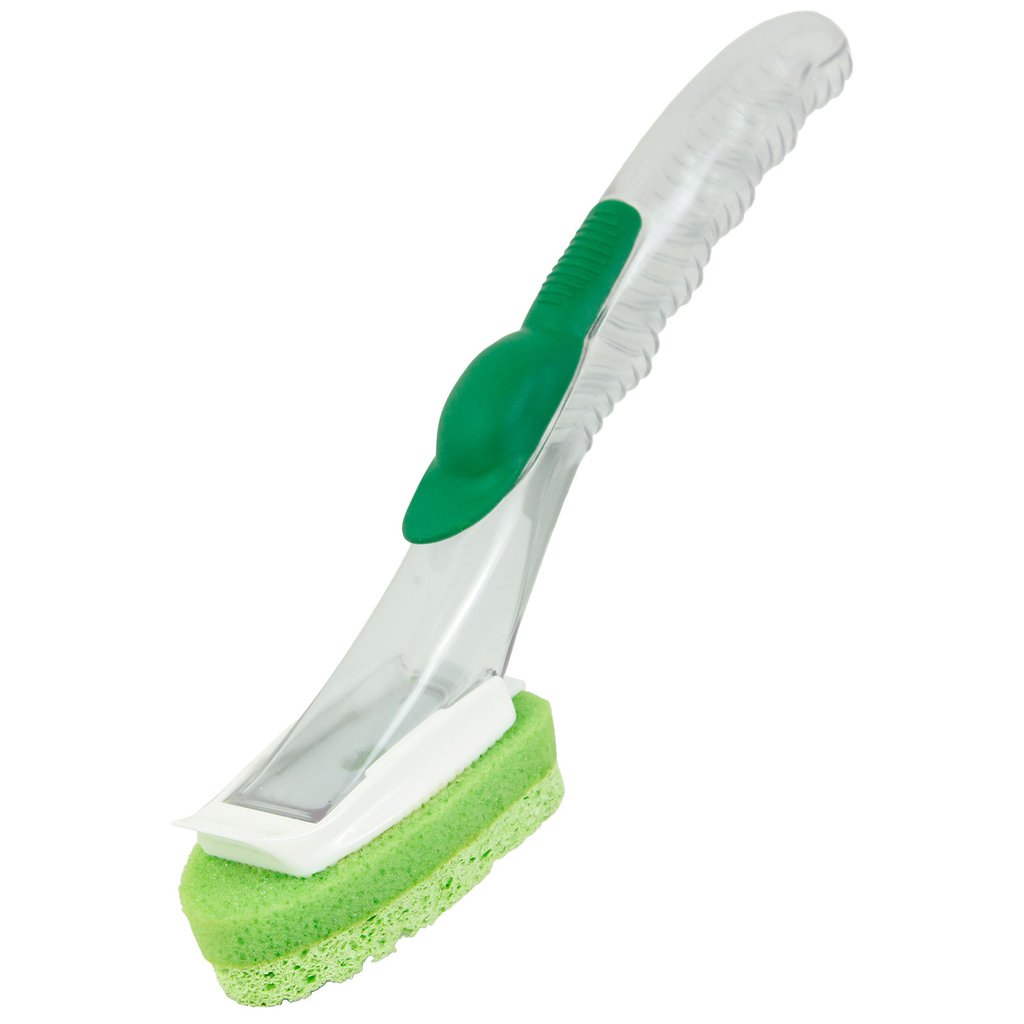 The Gentle-Touch Foaming Dish Wand features a sturdy, contoured handle with a rubber soap-dispensing button for easy refilling. Its durable, ergonomic design fits into tight spaces and corners for thorough cleaning.