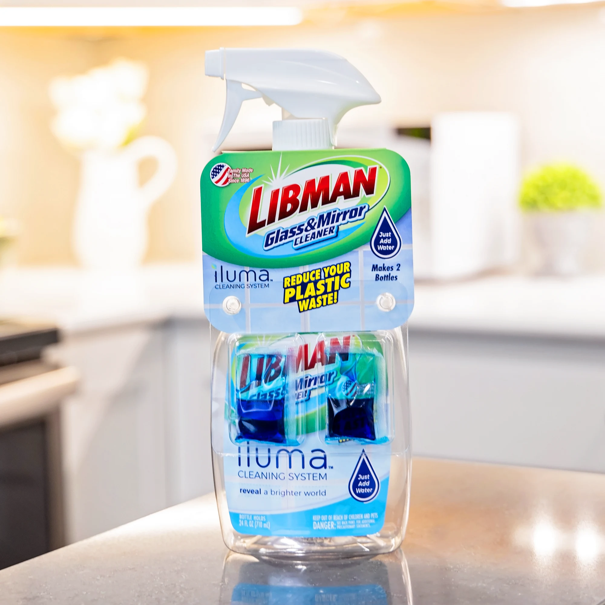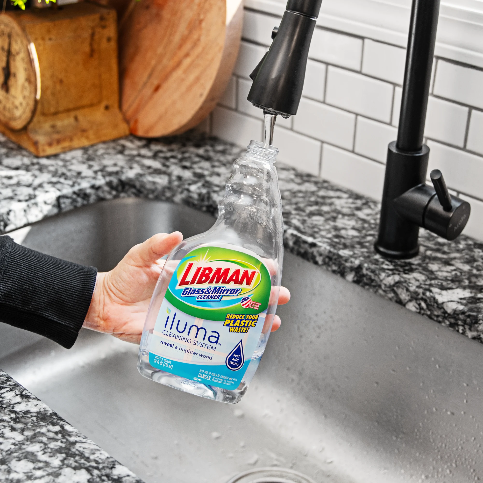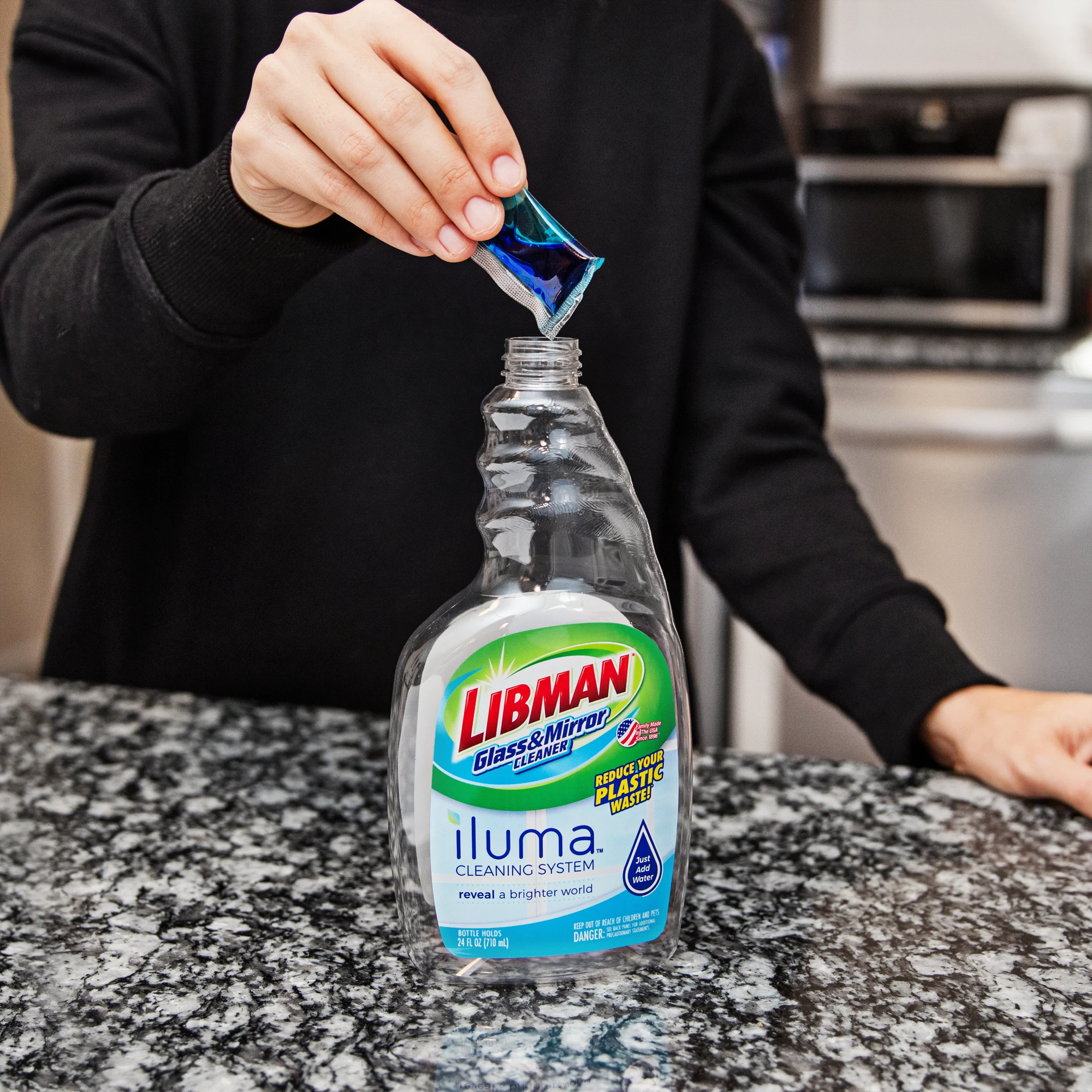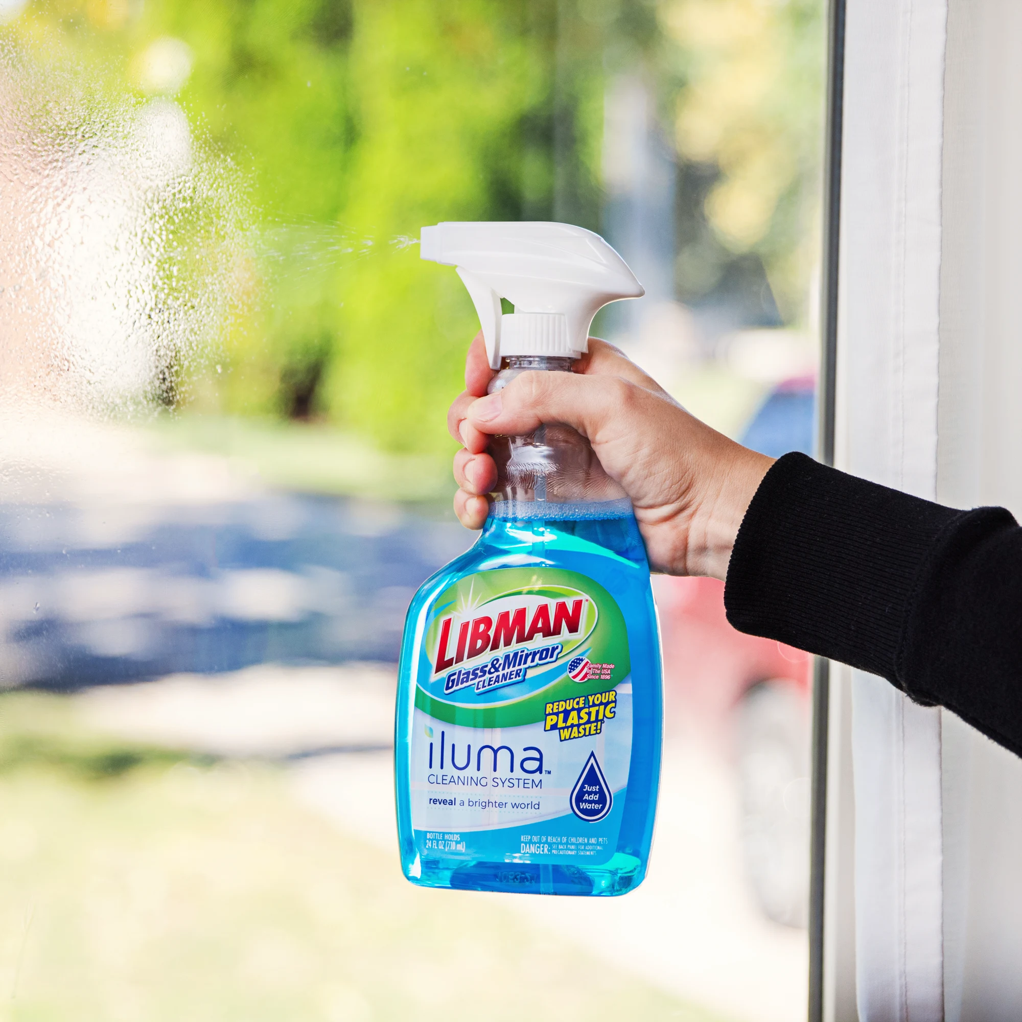 Reduce your plastic waste and clean your glass, chrome, and mirrors more completely with iluma™ Concentrated Cleaning Refills. At the Libman Company, we believe in creating quality products with cutting-edge technology to make life easier for you and reduce waste in the process. The iluma™ Cleaning System reduces plastic waste and carbon footprints by reusing plastic containers, and reducing your waste from plastic cleaning bottles by up to 90%!