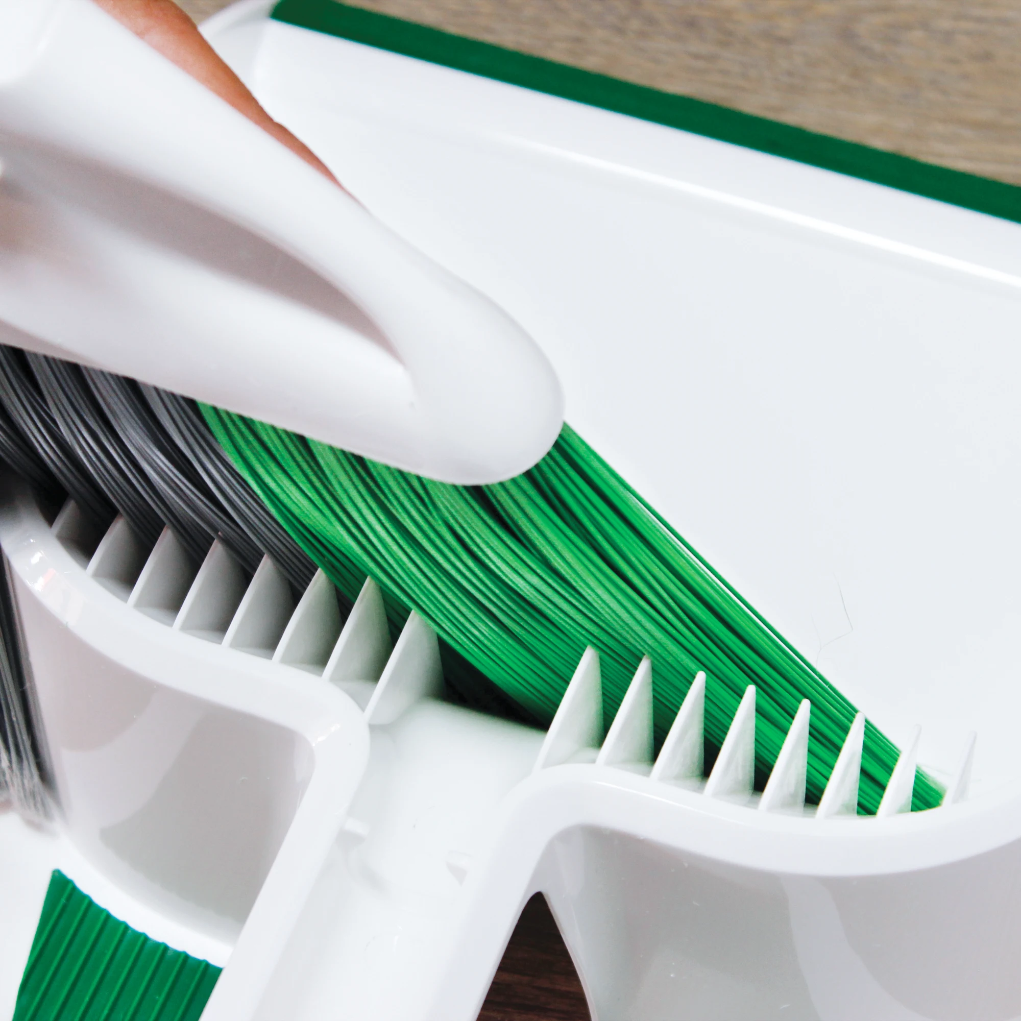 • Molded teeth remove dust and dirt from broom fibers