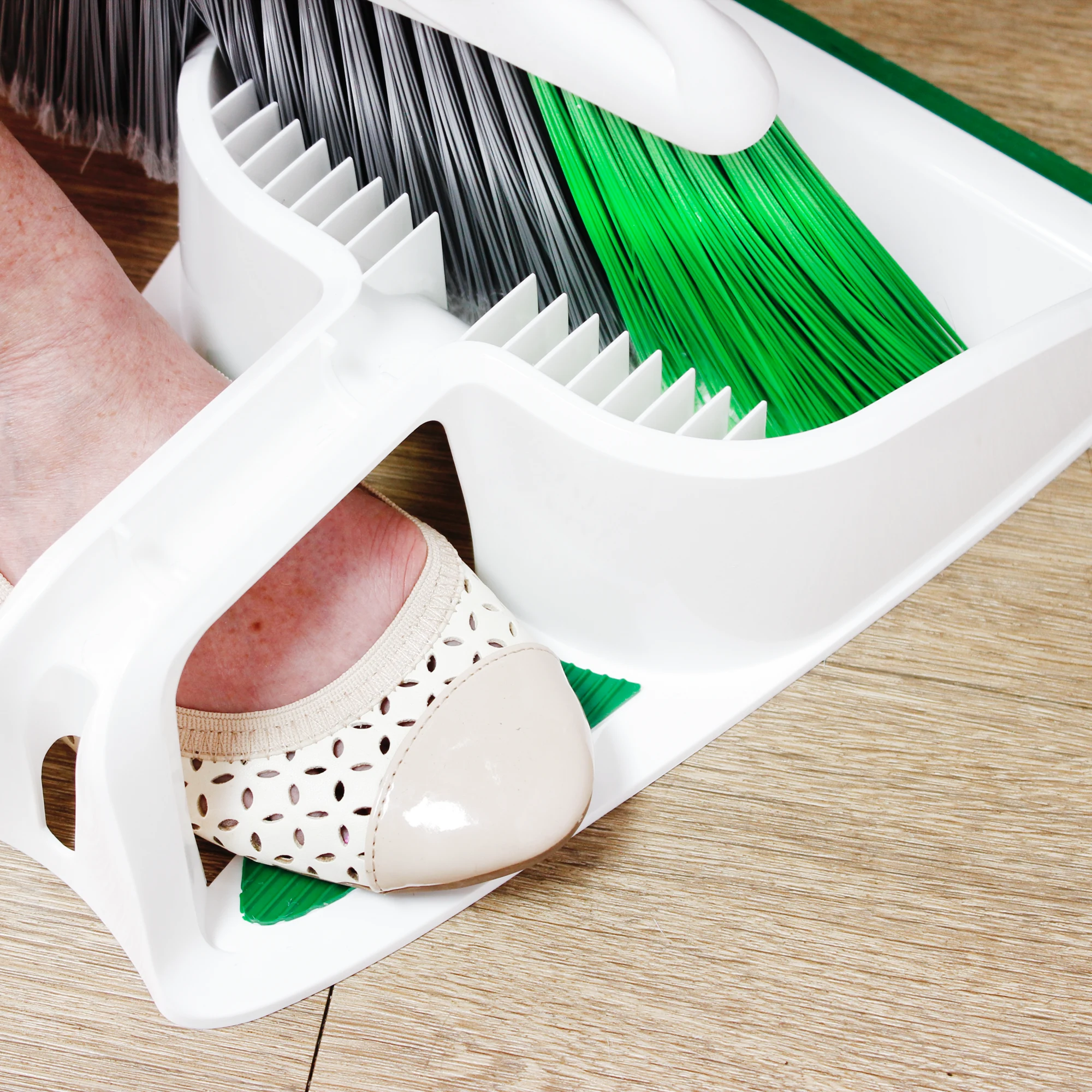 • Foothold promotes easy sweeping and scooping to minimize bending over