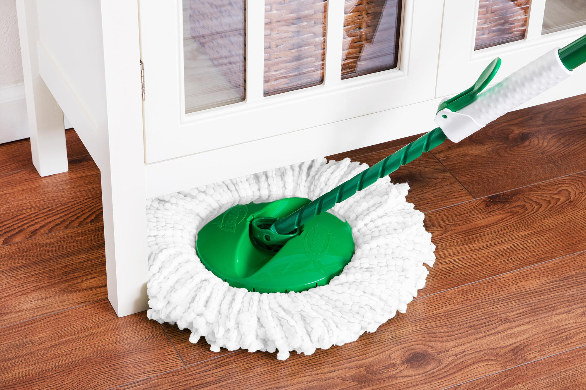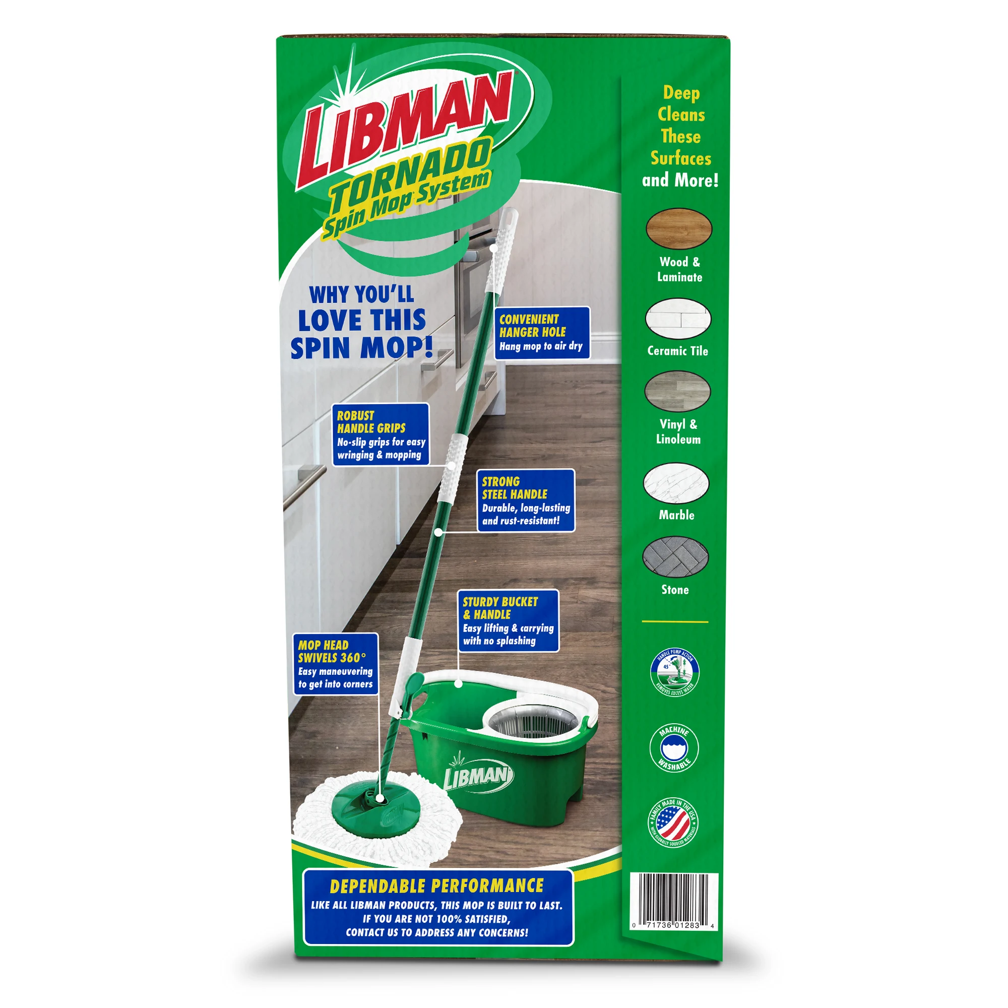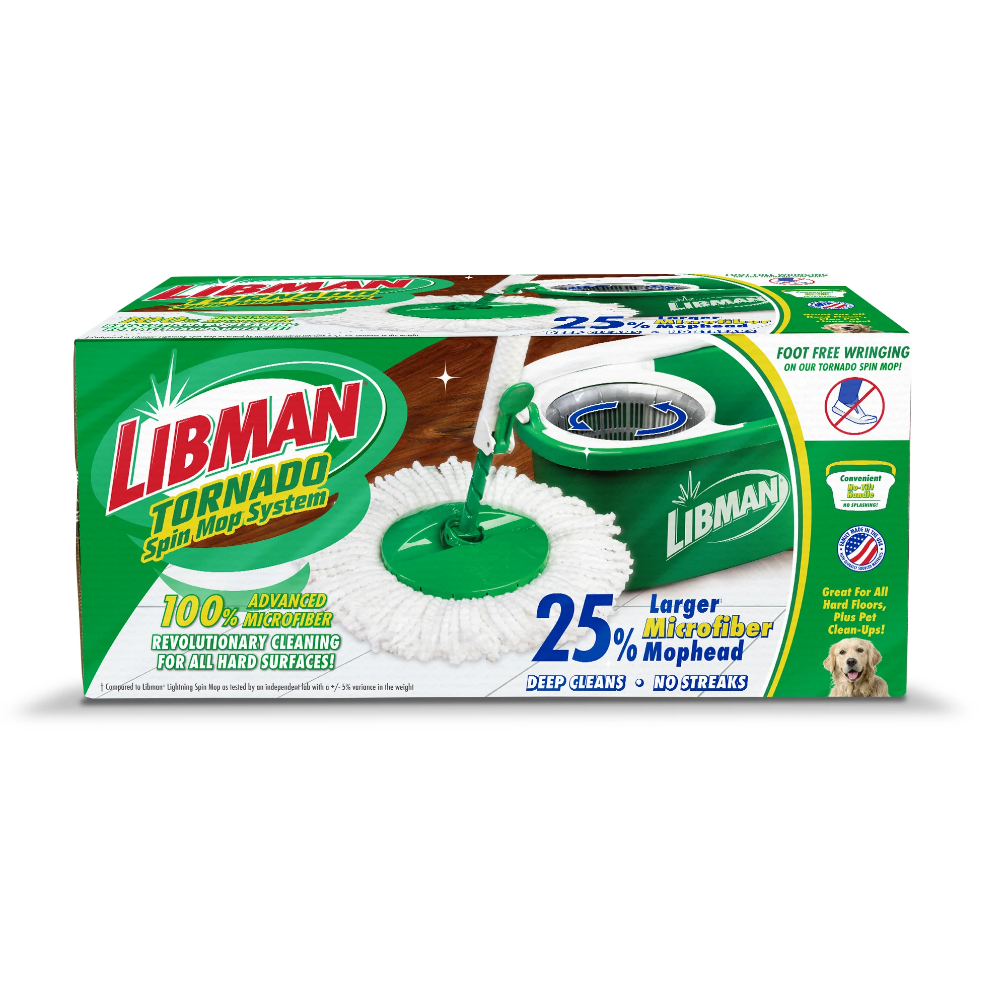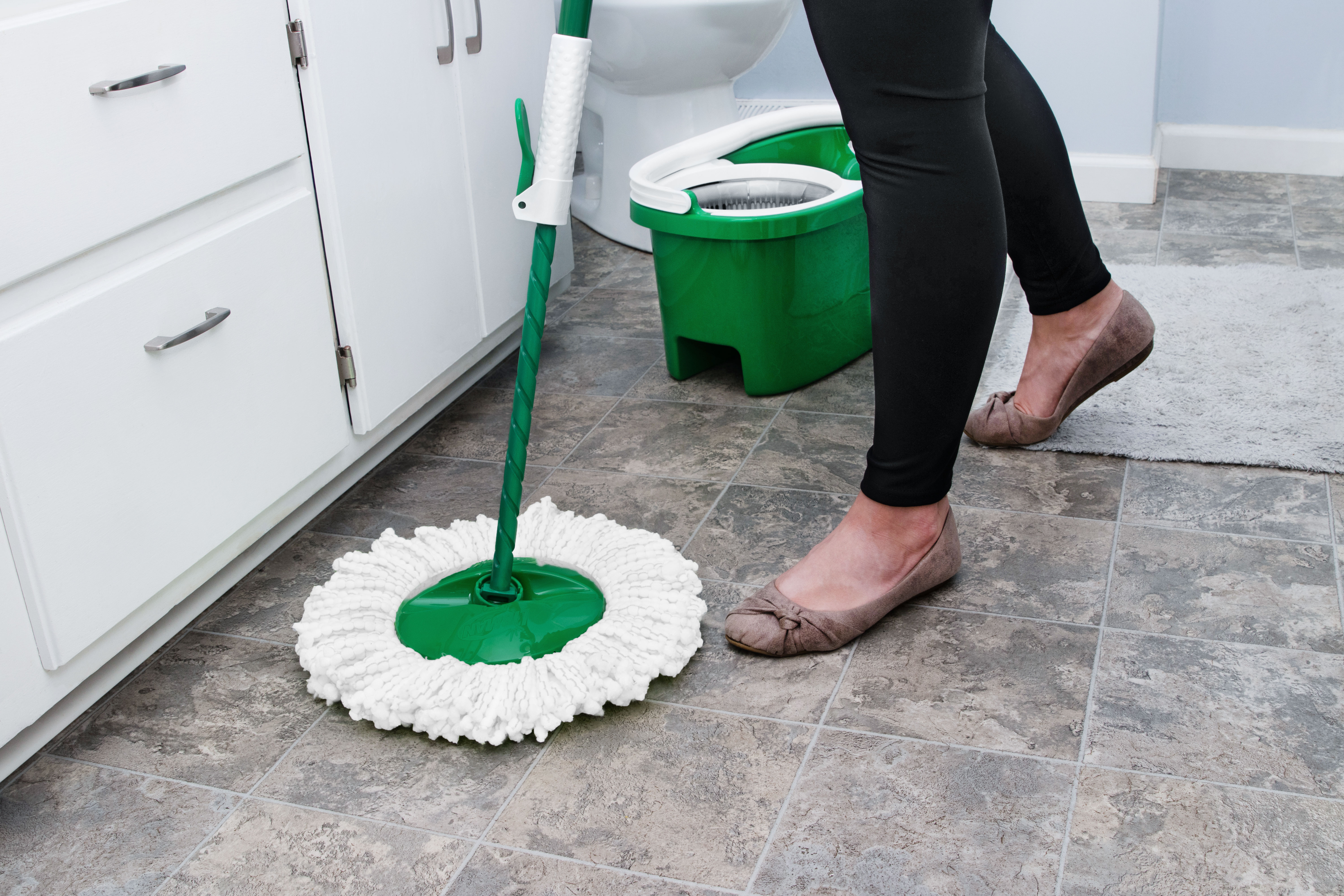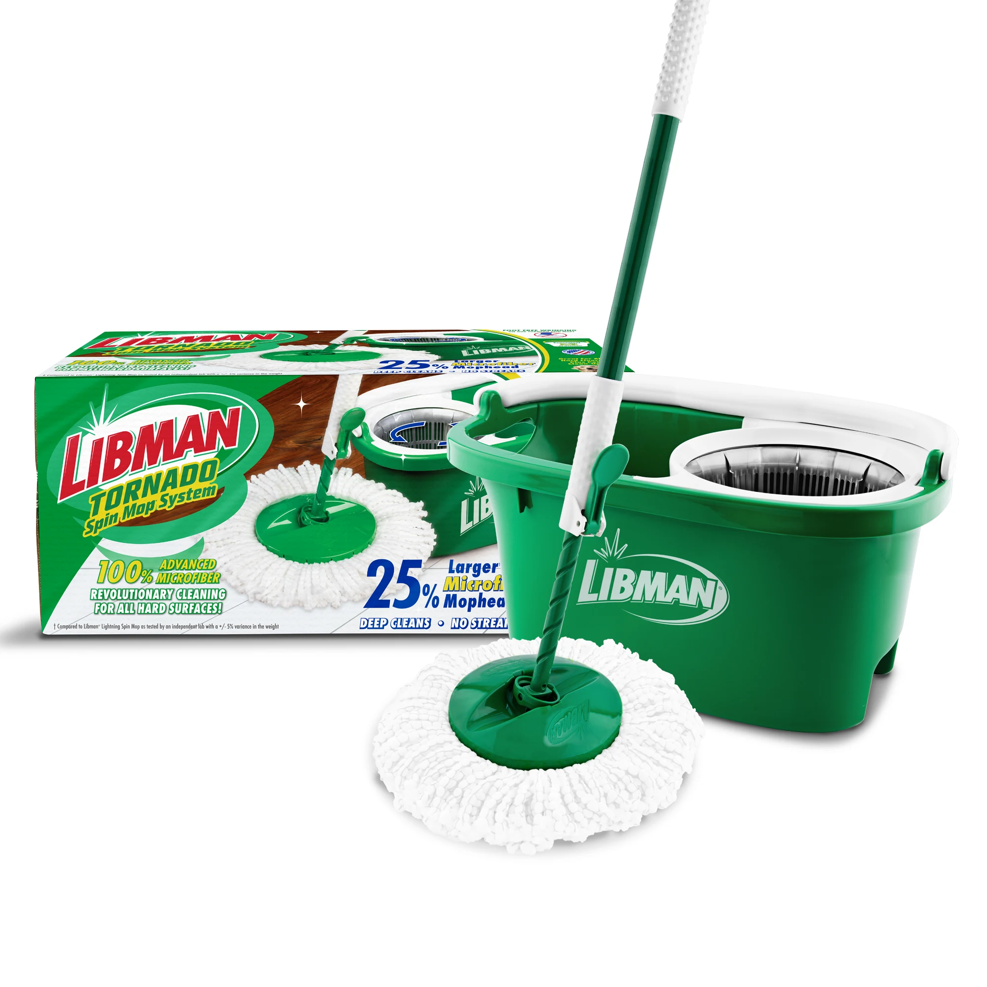 The Tornado Spin Mop® System is a convenient all-in-one mopping system. It was designed with a large microfiber, machine-washable mop head that absorbs and removes more water so your floors dry quickly. The heavy-duty bucket and spinning chamber work to remove water and dirt efficiently from the mop head. The lower handle is precision-molded and impact-resistant. You can unlock and push the handle down once for a damp mop or more times for a drier mop.